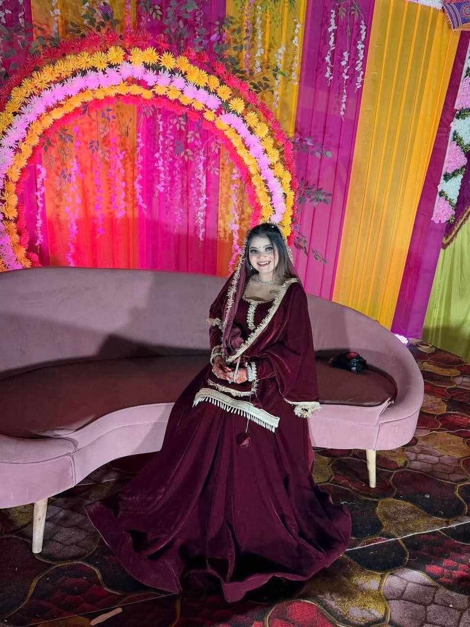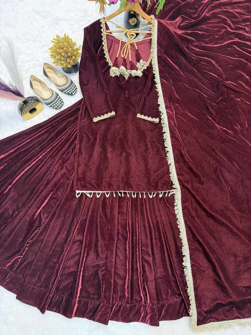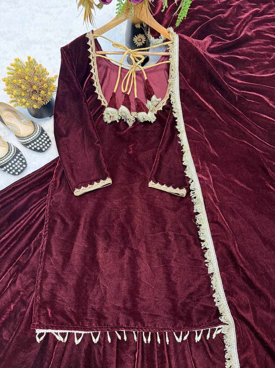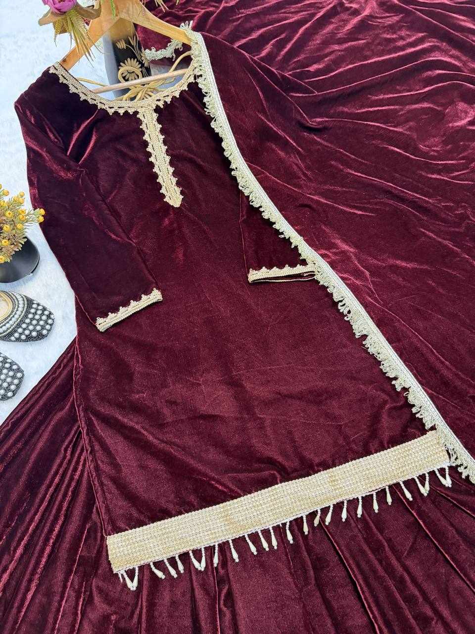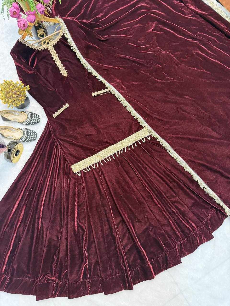 Fabric : Pure Heavy Viscose Velvet with Thread Work and Fancy Lace Sleeves